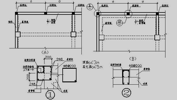 1 抗裂柱截面不宜大于墻厚×0.2m、或墻厚×窗間墻長(zhǎng)度。拉結(jié)筋設(shè)置同結(jié)構(gòu)柱,縱筋不小于4φ12,縱筋中心間距不大于0.2m,縱筋搭接長(zhǎng)度不小于0.6m,上下樓層交接處縱筋應(yīng)連續(xù)貫通,端部進(jìn)入基礎(chǔ)梁或屋面梁的錨固長(zhǎng)度各不小于0.5m,箍筋φ6@200,縱筋搭接范圍內(nèi)箍筋間距減半。