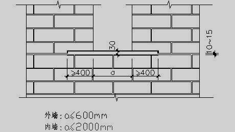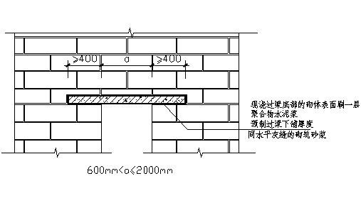 3.6.7 洞頂未設(shè)置主體結(jié)構(gòu)水平構(gòu)件處,當(dāng)洞頂凈寬大于0.6m但不大于2m時(shí),宜在洞頂處設(shè)置預(yù)制或現(xiàn)澆C20的鋼筋混凝土過梁。過梁的截面尺寸及配筋按設(shè)計(jì)計(jì)算確定,混凝土強(qiáng)度等級(jí)不宜低于C20,兩端伸進(jìn)砌體內(nèi)各不小于0.4m,如圖3.6.7所示: