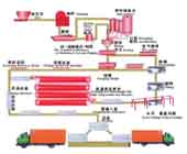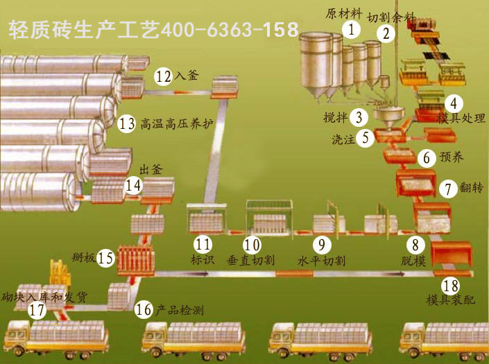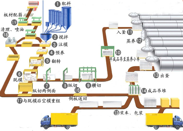 1)原料貯備倉(cāng)→(2)計(jì)量配料→(3)原料加水混合攪拌→(4)模具準(zhǔn)備→(5)澆注→(6)發(fā)氣靜?!?/span>7)脫模→(8)翻轉(zhuǎn),水平切割、垂直切割→(9)編組入釜→(10)高溫高壓養(yǎng)護(hù)→(11)成品出釜→(12)檢驗(yàn)成品→(13)碼垛貯存→(14)出廠