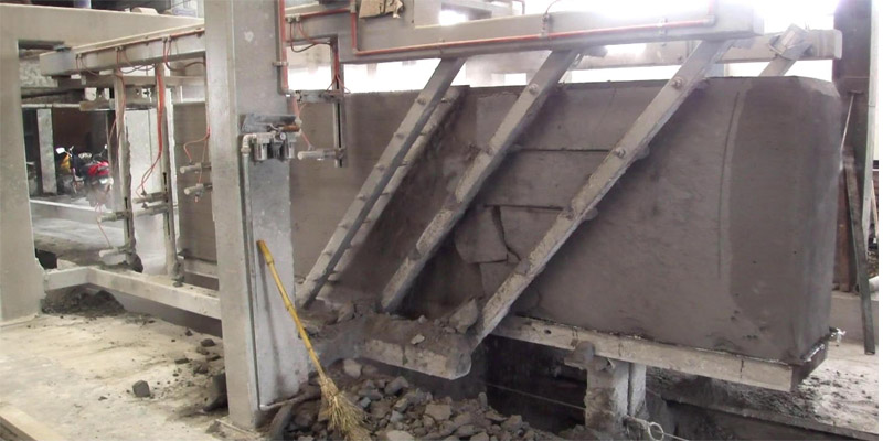 手動切割是一種簡單的切割方式,在模箱內(nèi)按所需規(guī)格尺寸于澆注前預(yù)先安置鋼絲。豎切時,用吊具緩慢的提拉模箱即可,縱切可用人工來按照規(guī)格切割,這種方法在切割過程中,如遇到行車提拉不穩(wěn)定,忽快忽慢,或者遇到夾雜物,可能引起鋼絲偏移,造成切割的不準(zhǔn)確,手動切割精度比機械切割稍微差一點。
