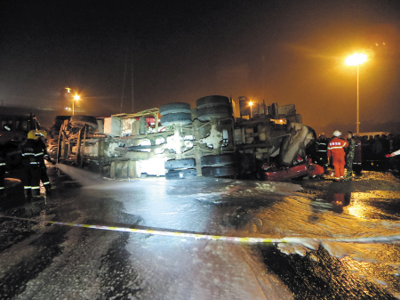 指揮員立即下達命令,由消防車在水泥罐車處架設一水槍陣地,對汽油進行引流沖散和泡沫覆蓋,防止二次事故的發(fā)生。