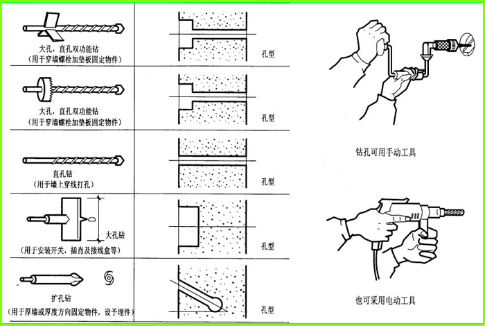 2 、擴(kuò)孔鉆的形狀如下圖所示,一般可工地自制,用Φ14 ~16 鋼筋一端用火燒紅后打扁,然后兩邊向反方向打彎,斷面呈形開(kāi)刃后即可。另一端用銑床出插口,插入電鉆即可使用,其使用方法是,進(jìn)入墻體為直孔,到底后將鉆頭桿繞孔轉(zhuǎn)動(dòng),底部即成擴(kuò)孔??淄鈴揭话銥?/span>035 、叨.孔頭約為中60 、65 ,這要視預(yù)埋件大小而定。深度應(yīng))100 (如吊掛物較重可適當(dāng)加大深度)打入時(shí)與墻體呈45 度角,用水沖凈孔內(nèi)渣末,灌聚合物水泥砂漿,插入鐵件。